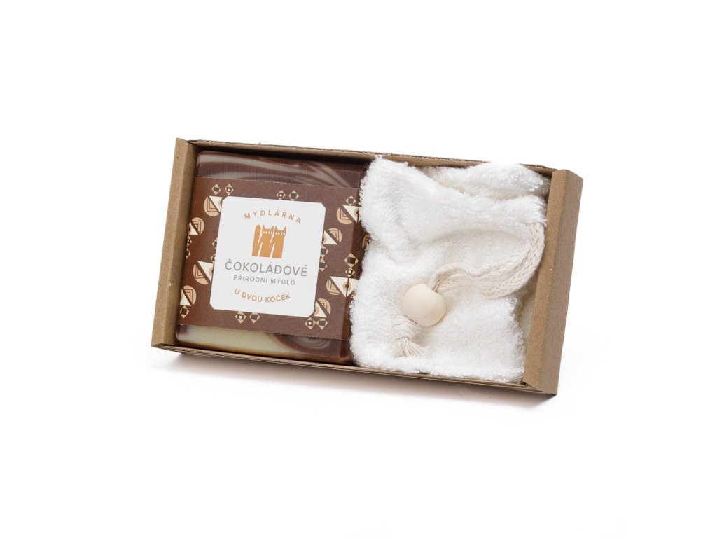 Dárkový balíček s čokoládovým mýdlem a velejemným sáčkem na mýdlo