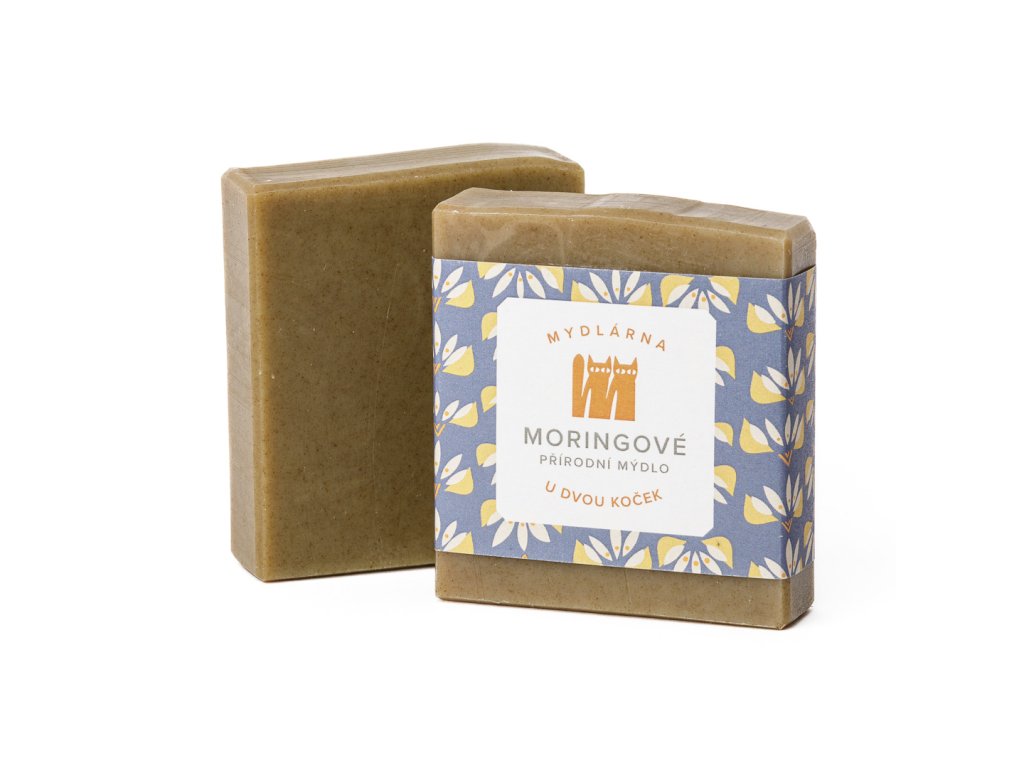 - Mýdlo neobsahuje palmový olej, živočišné tuky ani žádná umělá barviva. Jemně zelená barva mýdla vzniká díky moringovým listům.